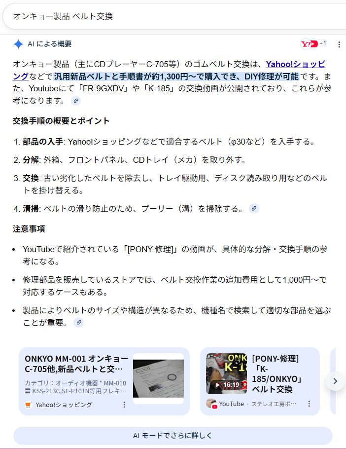 3)Google AIによる概要(「オンキョー製品 ベルト交換」で検索した結果)