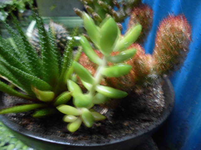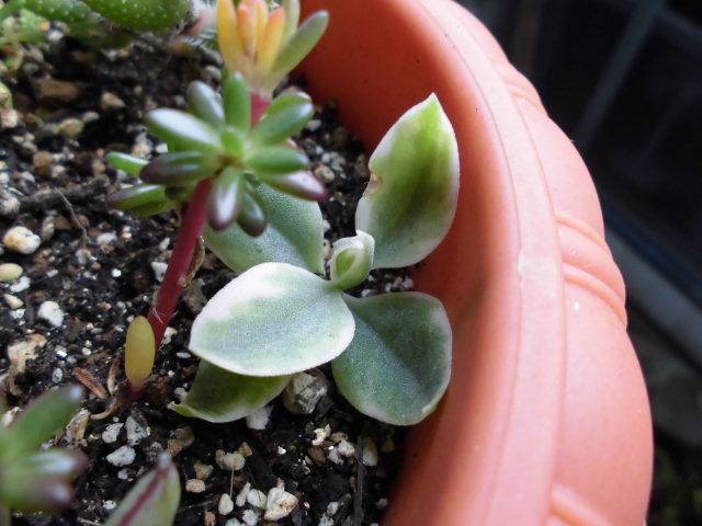 (2021,コメリ葉挿)成長は遅い[原]中米[成]上に伸びる。 [暑]強い[寒]強い(屋外越冬は無理かも?)[増]挿し芽[葉]簡単[高][速]普通[大]5cm[花]春。成長点[色][紅]全体が紅葉 |