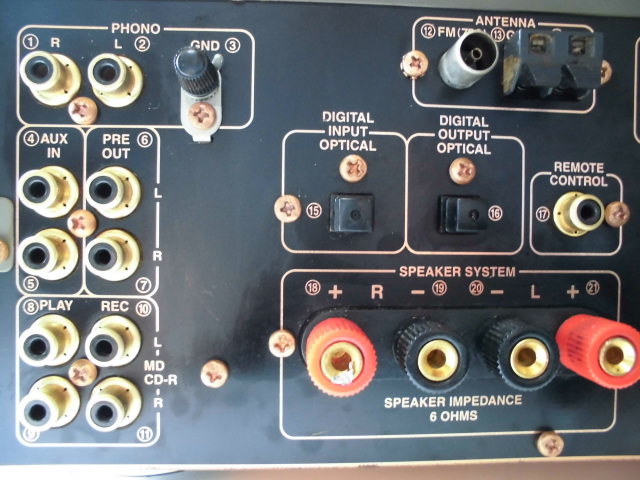 ・PHONO入力×1系統、アナログ入力×2系統(AUX,MD/CD-R)、アナログ出力×2系統(MD/CD-R,PRE-OUT)、