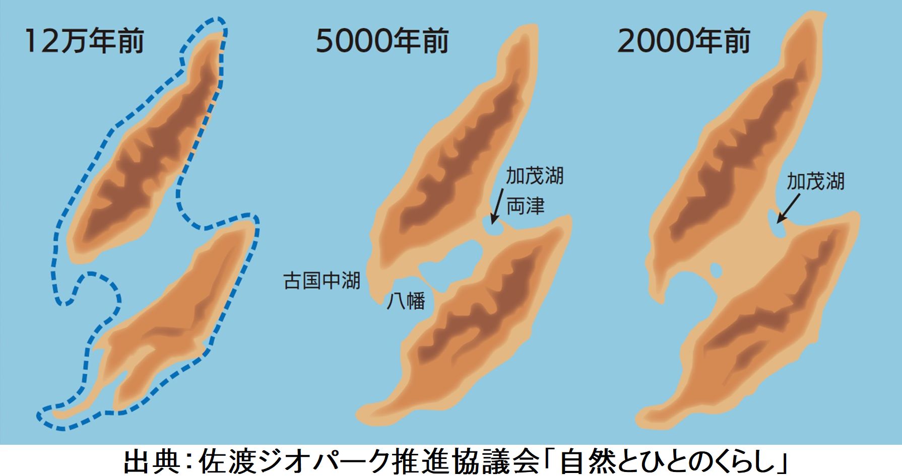佐渡島は、300万年前に海底が隆起し始め12万年前に大佐渡山地と小佐渡山地が現れた。国仲平野はまだ海の底であった。その後も隆起が続き中央部も徐々に陸地化するとともに両山地からの土砂が流れ込み2000年前に国仲平野が形成された。佐渡島は今でも隆起が続いており、1802年の小木地震では2メートルの隆起があった。加茂湖周辺が陸地化したのは最後の最後で、その湖畔にある吾潟に人が住めるようになったのも弥生時代晩期かそれ以降であろう。「市詩」にも「今より水位が10メートルも高く、田ノ浦や品ノ浦の入り込んだ沢のだいぶ奥まで潟の水が浸入していた」とある。また「弥生時代や古墳時代の吾潟については、これを語る資料が全くという程ない」とは残念であり、吾潟の歴史は平安時代の「牛尾神社」創建から始まる。 ちなみに、「佐渡」の地名が日本史に最初に登場するのは日本創生を記した「古事記」であり、国生み神話に大八島の7番目として登場する。 佐渡の由来は「狭門(さど)」説が有望で、大佐渡と小佐渡が分かれていた頃にその間の海を指したという。もしかしたら、加茂湖と両津湾の隔てる砂州(さす)を門と指したかも?あるいは両津湾から真野湾に通り抜けるときに両山地が門の様に見えたか? 佐渡は古くから流刑の地に定められ、著名人としては万葉歌人の穂積老、順徳上皇、日蓮聖人、世阿弥などが佐渡に流されてきて、島内での生活は自由であったため佐渡各地の文化を大きく発展させた。ちなみに、真言宗系列の寺だけでも空海ゆかりの四国にある八十八ヶ所霊場から土砂を分けてもらった由緒正しい佐渡八十八ヶ所霊場があるほどに、島内にはお寺が多く存在するのも日蓮に深く関係するところだろう。新潟県で唯一の五重塔が妙宣寺である。神社や能舞台も島内に多く存在する(日本全国の能舞台の1/3が佐渡にある)のも世阿弥が大きく関与していることだろう。 奈良時代には北陸道の内の一つの国(佐渡国、別称:佐州,渡州)となり、徳川・江戸時代には幕府直轄となるなど、一般的に思い浮かべる離島のイメージとは歴史的にも文化的にも大きく様相を異にし、日本史を語る上でも重要な地である。 詰まる所、佐渡は、気候的(植物の北限と南限が重なっていて植物や果物の種類が豊富)、海洋的(暖流と寒流がぶつかるので魚種も豊富)、地形的(山あり海あり平野あり)、歴史的(多様な高名文化人が渡来)、文化的(鬼太鼓や能などの伝統芸能が豊富で盛ん)等々、あらゆる点で見てもまさに「日本の縮図」と言える。 |