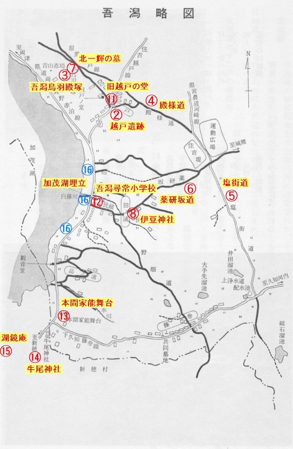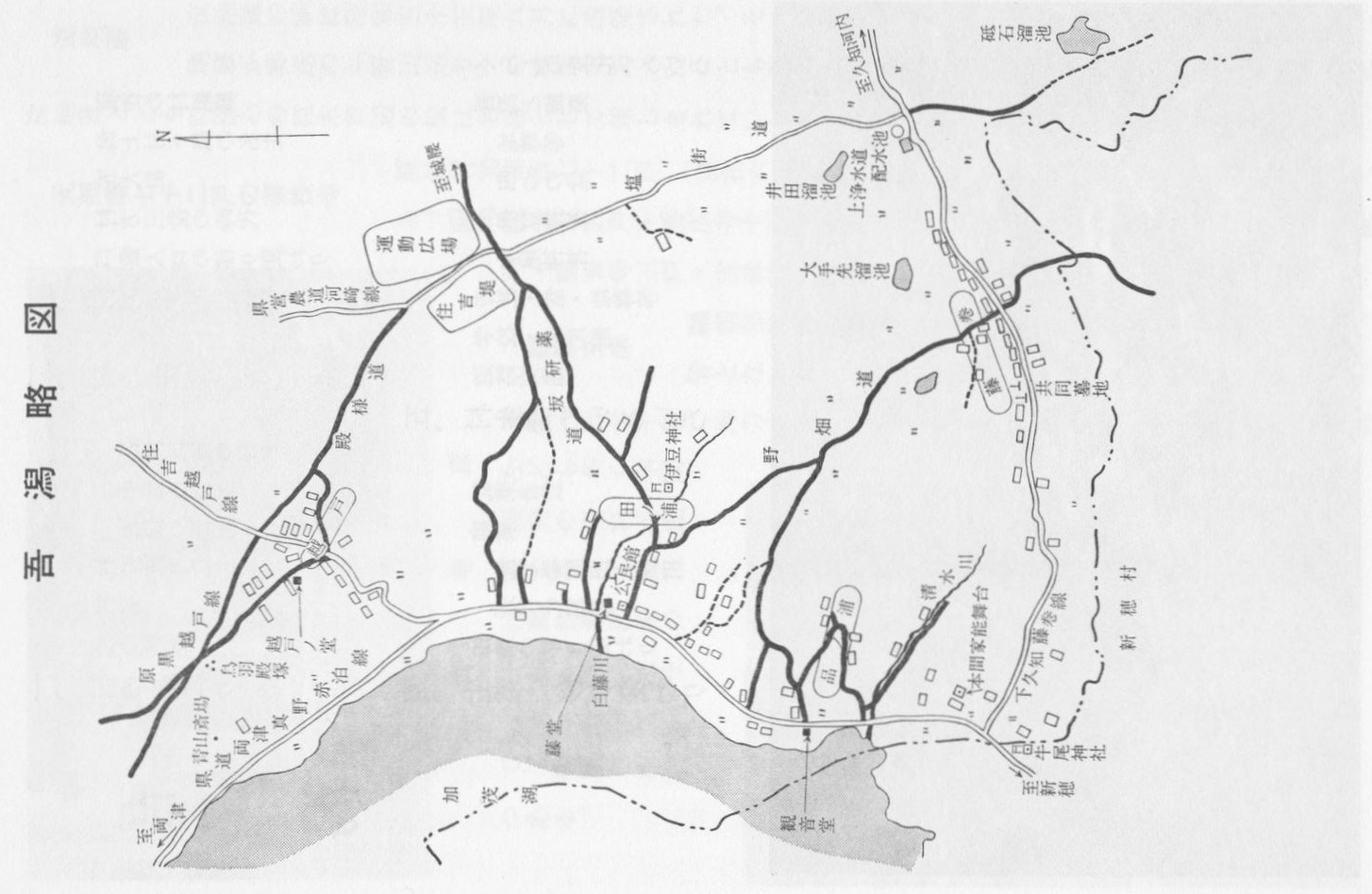| 右の地図は「両津市詩」に記されている吾潟の地図である。名称や位置などを見ると現代版の様であるがGoogleマップには記載されていない旧街道名も記載されており、吾潟の歴史を紐解くヒントになる。 さてここで吾潟集落の方に問題です。左の図には、間違いor今と違うところが何か所かあります。それはどこでしょうか? |