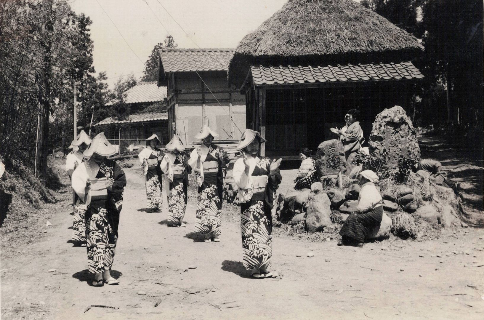 現在の越戸集会所は場所も移動して新しく建てられたものでありが、かつての越戸の堂(旧喜左衛門堂)は県道から上がった道と住吉および原黒に抜ける三叉路(越戸中心部)にあった。その頃は、道路に大きな幕を張って映画を上映していた。 原黒に抜ける道(左手)が幹線で、右にある道は細く住吉海岸まで通っていたのかどうかは不明。踊り手はおそらくは吾潟婦人会の皆さんであろう。吾潟幼稚園の園児数が多いという事は若いお母さんの数も多かったであろうから、当時の婦人会の活動も活発であったに違いない。 堂前にある二つの石碑は、今もそこに残っている。 ![]() 写真提供:熊谷藤右衛門(越戸) |