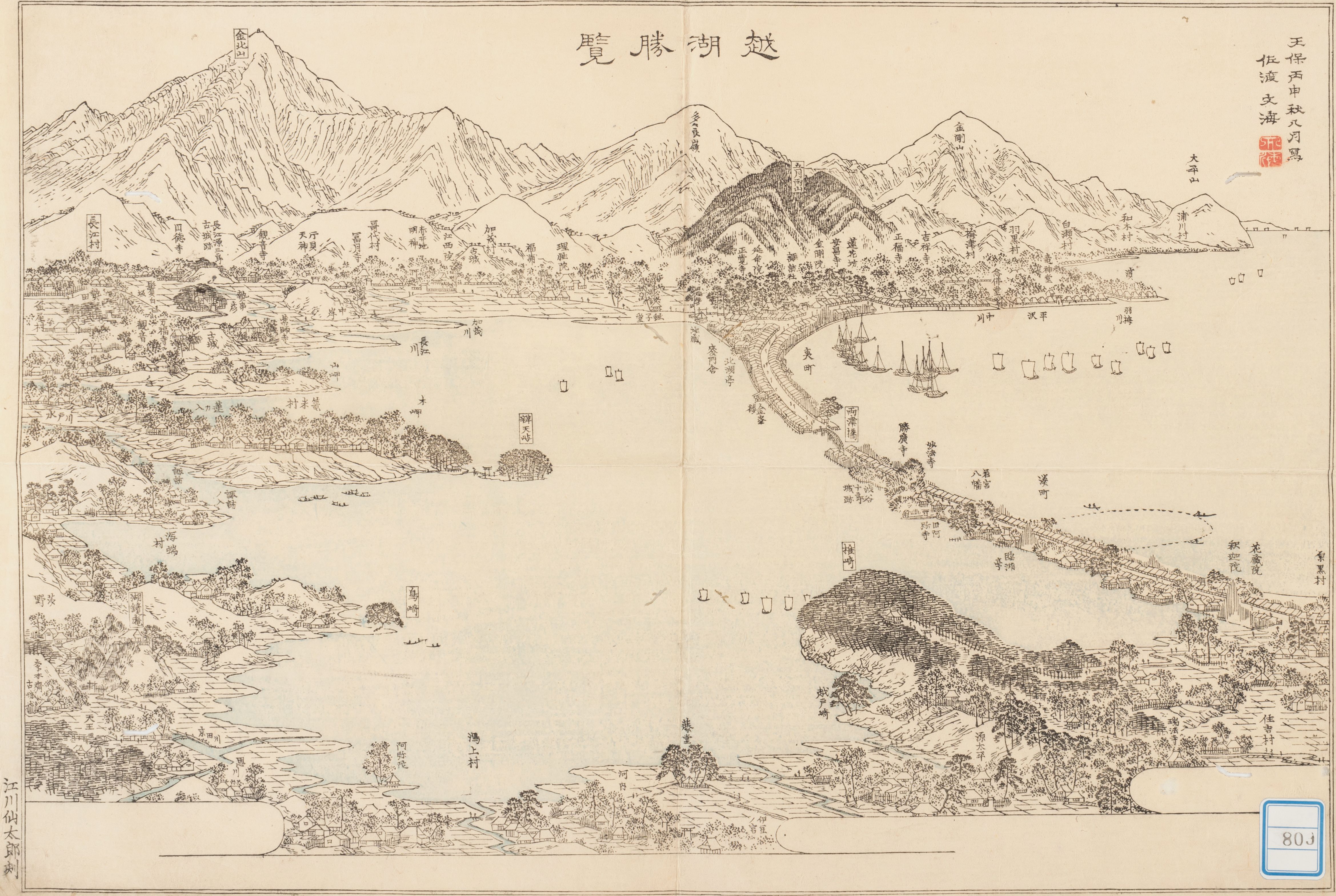 右下の地図は、天保7年(1836年)に石井文海という佐渡奉行所の絵図師が吾潟から見た加茂湖周辺を描いた「越湖勝覧」(相川郷土博物館蔵)である。この絵図は「湖鏡庵」でいつでも見る事ができるが、加茂湖畔部が青く塗られており後に刷られた版と思われる。 吾潟集落周辺には「越戸崎」「源太平」「藤堂」「河内」「伊豆ノ宮」の文字が見える。吾潟史を紐解くキーワードであろう。 ちなみに四角く囲われている地名が儒学者であった芥彦章が詠んだ「加茂湖八勝」で、現在の「 さてここで難易度MAXの問題です。右の図で上記の年表と合わない個所があります。どこでしょうか? |