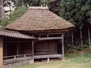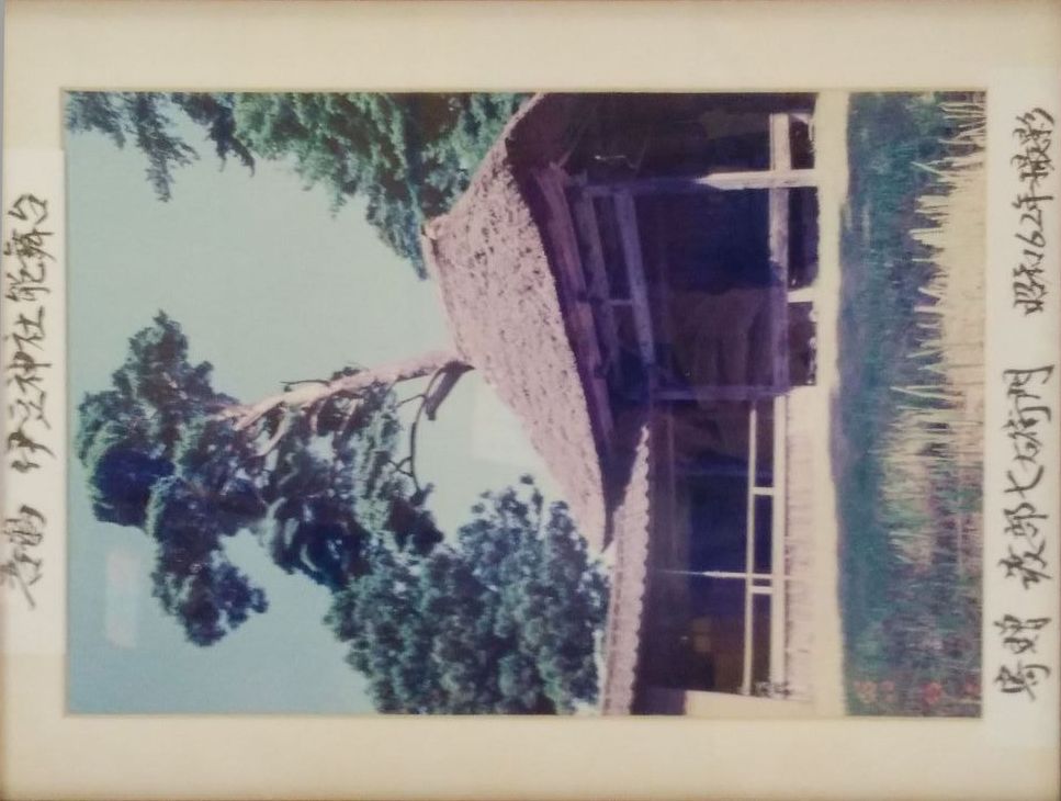 伊豆神社は、「吾潟藤堂前」バス停前の道を山手に徒歩5分歩くと右手に山に向かう細い道があり50mほど進んだ左手にある。住所は新潟県佐渡市吾潟593-1。電話はない。 祭神は磐長姫命(いわながひめのみこと)。佐渡国寺境内案内帳には社人・由緒なしとある。しかし、弘化三、嘉永4年の宗門人別寄帳(源太郎家文書)には社人渡辺寿司とでている。元禄検地では伊豆権現社除とあるが開基年代は不詳である。(市誌) 祭礼は9月12日であるが近年は8月12日に繰り上げ実施され、牛尾神社宮司が兼務で執り行う。 開基当初は田ノ浦地区だけの神社だったがその後は吾潟集落全域が氏子となった。集落の人は「ごんげんさん」と呼ぶ。 かつては右の写真(吾潟公民館に展示)のような風情のある藁葺きの能舞台があったが、平成10年(1998)8月4日に裏の山から豪雨によって大量の土砂が崩れ落ちてきて能舞台は倒壊してしまい、現在は存在しない。土台等の跡地も土に埋まったままであろう。ここで実際に演能されたのかどうかも不確かであり、根拠のない推測的記事の紹介は控える。 昭和52年に日本大学芸術学部美術学科住空間研究室の学生数名がやってきて、能舞台を実測し16枚の図面を送ってきた(吾潟史)。その気になれば復元可能。原本が残っているならデジタル化して保存しておきたいところだ。 佐渡島内で一番謎だらけの神社である。 ※「能楽古跡紀行第六巻佐渡の能舞台めぐり」での記述 寄棟茅葺きで複式橋掛かりの、いかにも佐渡らしい舞台は、雨戸も無くひどく荒れ果てて倒壊寸前、いずれは消える運命にあると思われる。敷地の関係か舞台のすぐ前が山の斜面で、こんな狭い所にも舞台を建てた昔のエネルギーに驚かされる。 |
